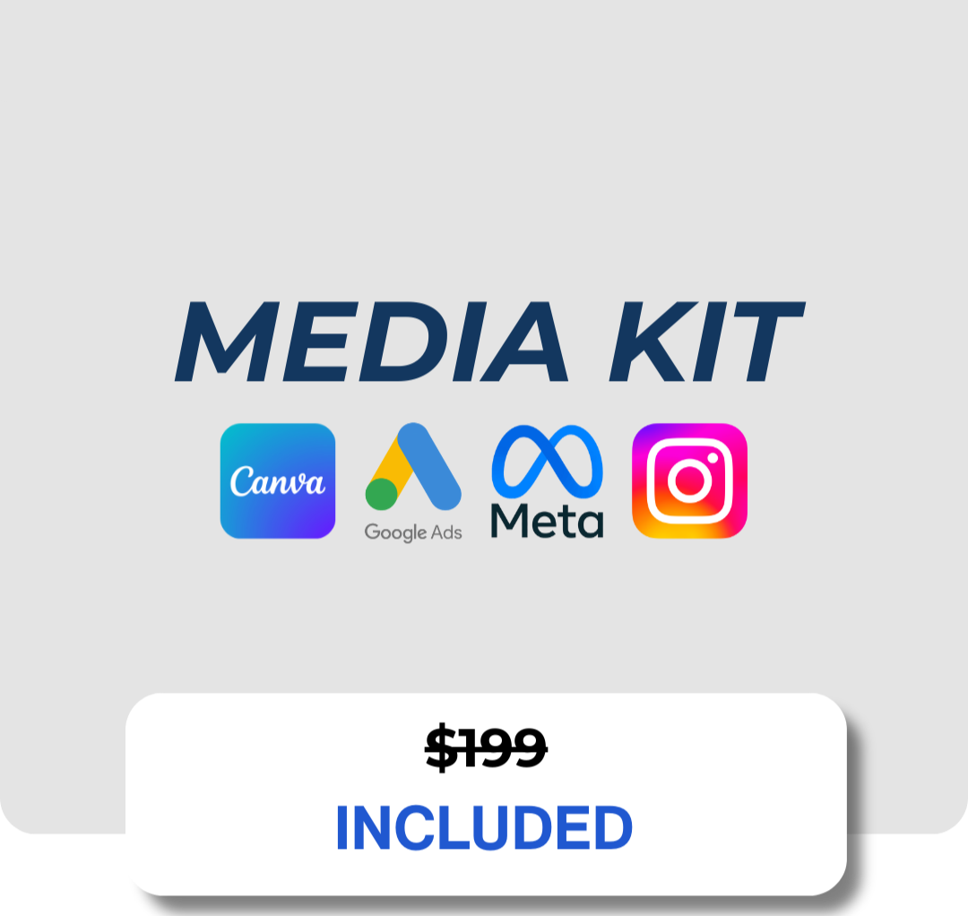 No ad creatives? No IG templates? No Google Ads copy? No problem. You get our Media Kit with video ads, Canva templates, Meta ad copy, and caption ideas so you can start today.